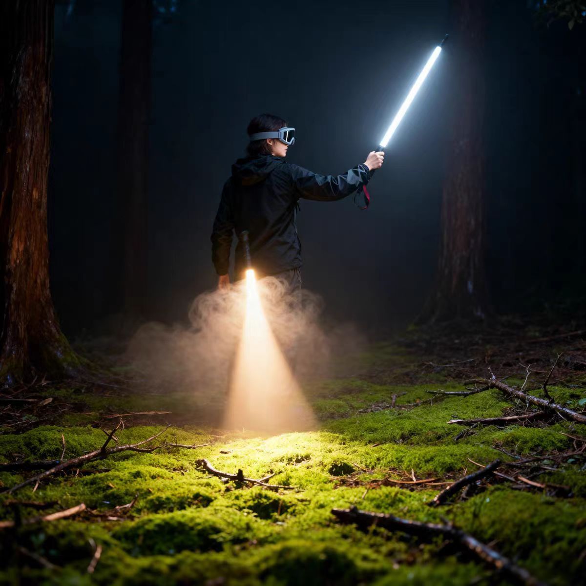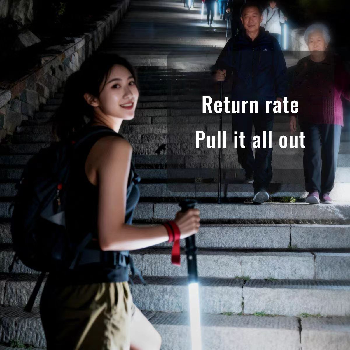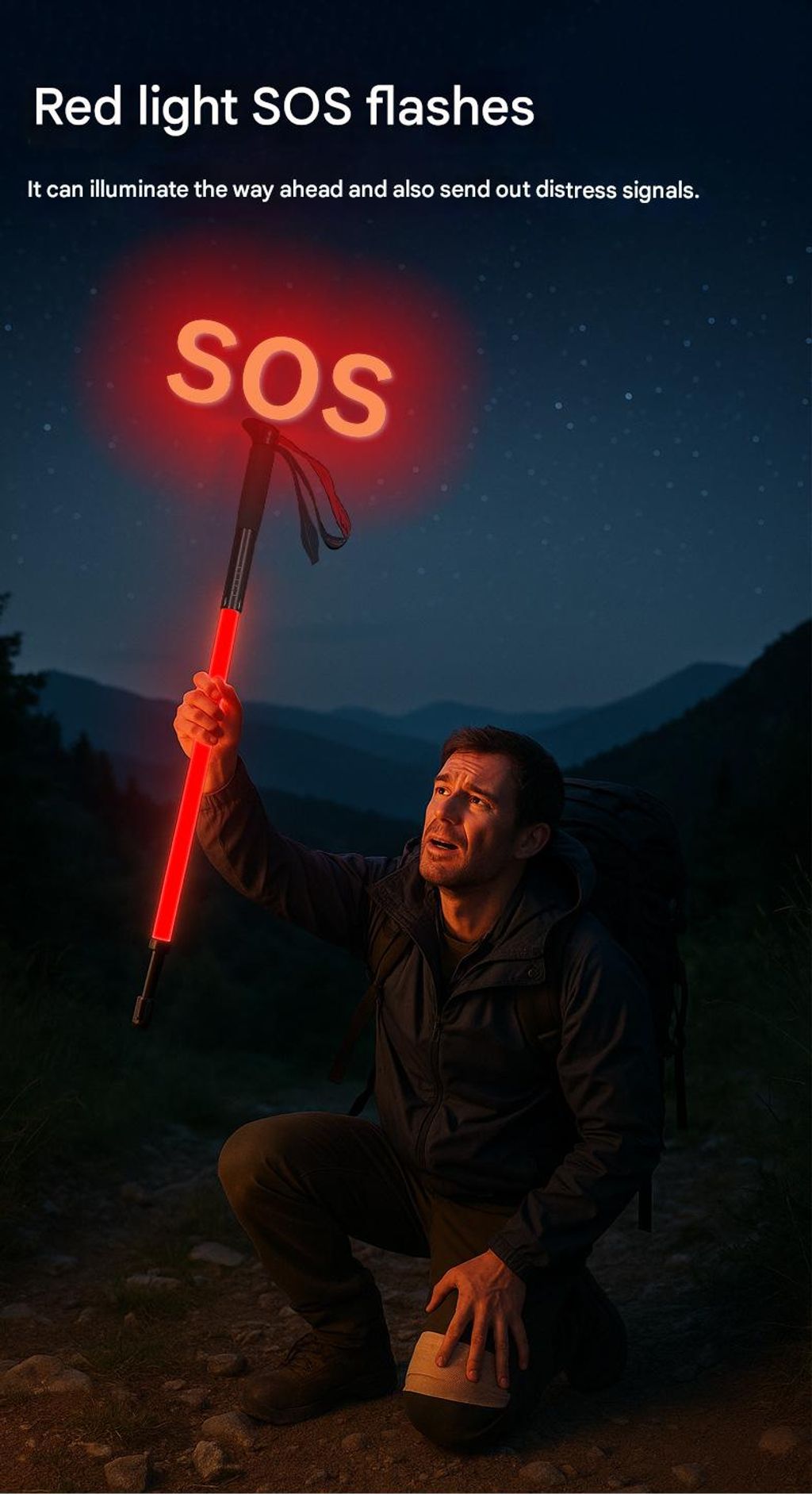 Professional night hiking equipment: ultra-lightweight trekking poles with lighting for convenient hiking.